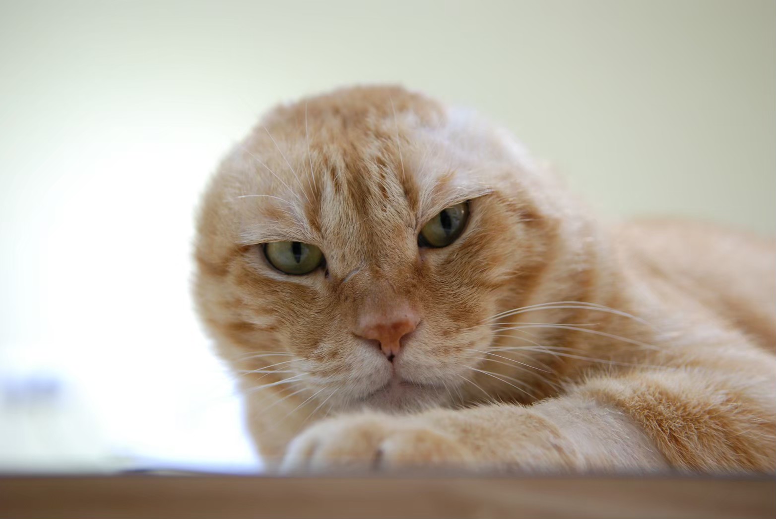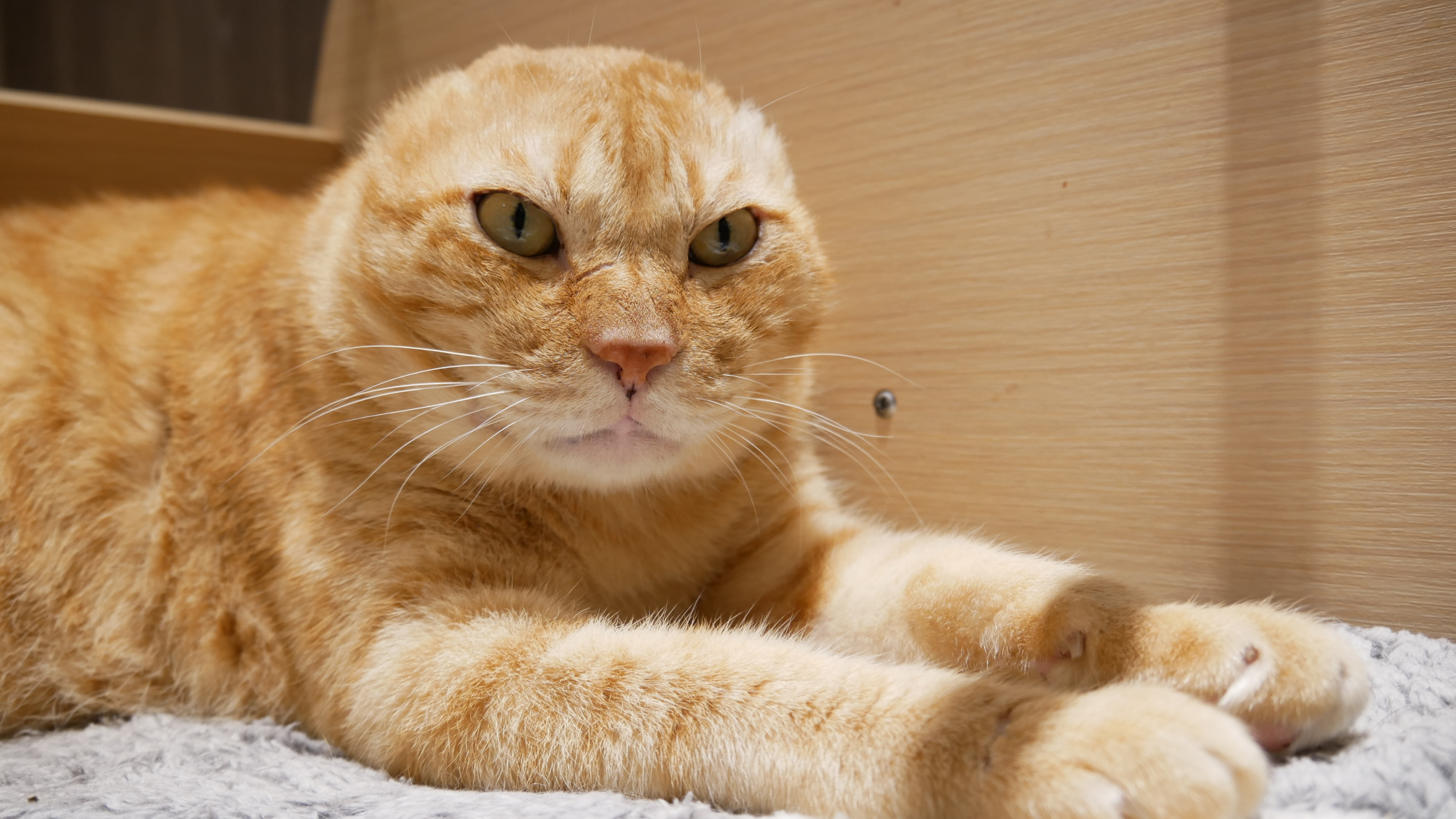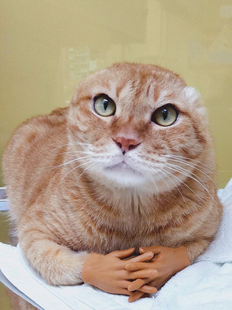 沒了耳朵的大頭黃,經照護親訓後脾氣越來越好,也許他發現這是一個很安全有愛的環境,放下了脾氣與心防,變得非常親人,現在任何人來協會坐在地上,大頭黃馬上就會到你大腿上坐好坐滿,所以很多人都會特地來看他!稱職的他很快地就被大家封為貓瘋院長。